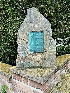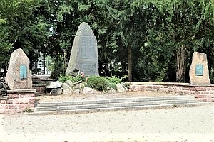 Alter Friedhof, heute Parkanlage beim Klinikum. Links und rechts des Denkmals für die im Jahre 1849 in Rastatt standrechtlich erschossenen Freiheitskämpfer steht je ein kleinerer Findling mit einer Metalltafel für KZ-Opfer.
