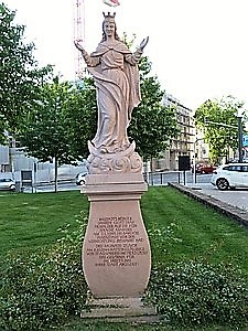 Pagodenburganlage. Die Marienstatue aus Schwarzwälder Sandstein, Kopie der Maria Immaculata der Einsiedelner Kapelle, wurde vom Endinger Steinmetz und Bildhauer Martin Gutmann erschaffen und 2017 feierlich eingeweiht. Sie erinnert an die Errettung der Stadt Anfang Januar 1945.