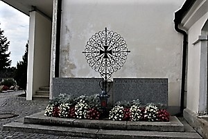 An der Kirche; zwei Marmortafeln und dazwischen schmiedeeisernes Kreuz