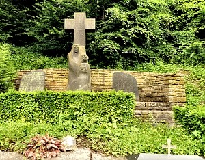 Das Denkmal steht auf dem Friedhof im Stadtteil Rheineck am oberen Rand des terrassenförmig angelegten Friedhofes. Es besteht aus Basaltlava. Vor einer flachen Bruchsteinmauer ist ein Steinkreuz errichtet, davor eine Frau, die einen zusammen gesunkenen Mann hält. Nur die Köpfe sind aus dem Stein herausgearbeitet, andere Teil des Körpers nur angedeutet. An der Seite das Kürzel „G“ in einem Kreis, es stammt von dem Bildhauer Georg Gehring aus Adenau. Links und rechts neben dem Kreuz stehen zwei Steinplatten mit den Namen der Gefallenen beider Weltkriege. Die unteren Ränder der Platten sind durch Versinterung schlecht bis überhaupt nicht mehr lesbar. Auf dem Stein links ist unten eine Widmung von der man nur noch das Wort „Opfer“ erkennen kann.