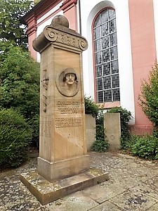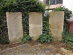 Sandsteinstele I. Weltkrieg im Aussenbereich der Kirche. Alle vier Seiten sind beschriftet. Dahinter befinden sich drei Steinplatten mit den Namen aus dem II. Weltkrieg.