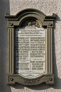 Zur Erinnerung an die ruhmvollen Siege der deutschen Heere im Feldzuge gegen Frankreich und Deutschlands Einigung 1870-71 Von dieser Gemeinde waren einberufen: (Namen) Gestiftet von der Gemeinde Riedöschingen 1889