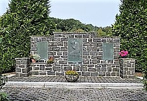 Gemauerte Wand, darin sind eine Platte mit einer knienden Frauenfigur mit Inschrift, sowie zwei Gedenkpaltten eingefügt.