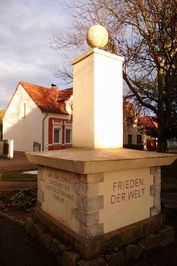 Kirche. Friedensdenkmal auf einem Dorfplatz, Quader mit aufgesetzter Säule, gekrönt