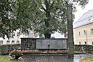 Bei der Kirche; gemauerte Wand mit Namenstafeln, davor hohe schlanke Säule; zusätzlich Daten von privaten Gedenksteinen
