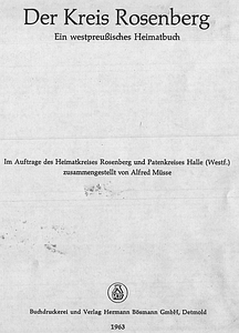 Kreis Rosenberg, WestpreußenDer Kreis Rosenberg, ein westpreußisches Heimatbuch, im Auftrage des Heimatkreises Rosenberg und Patenkreises Halle, Westf. Zusammengestellt von Alfred Müsse, Buchdruckerei u. Verlalg Hermann Bösmann, Detmold 1963