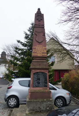 Das Kriegerdenkmal in Form eines Obelisken auf drei Stufen befindet sich in der Nähe der evangelisch-lutherischen Trinitatiskirche. Den Mittelteil ziert ein Wappen, auf der Spitze sitzt ein Helm. Die Tafel mit den Namen der Soldaten ist im untersten Teil eingebettet. Zwischen den Jahren 2020 und 2022 wurde das Denkmal restauriert und Inschrift sowie Namen wieder lesbar gemacht.