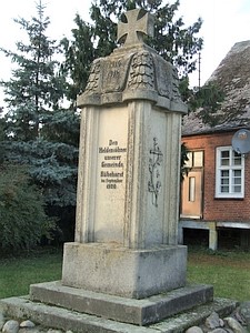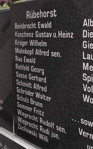 Denkmal Vorderseite Den Heldensöhnen unserer Gemeinde. Rübehorst im September 1920 Denkmal Rückseite: Es starben den Heldentod fürs Vaterland (Namen)
