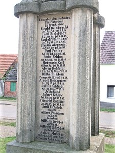 Die Gefallenen des 1. Weltkriegs werden ebenfalls auf einer Gedenktafel in der Kirche Großderschau notiert. Dort befindet sich auch eine Tafel für die Gefallenen des Krieges 1870/71. Die Gedenktafel für die Gefallenen des 2. Weltkriegs in der Kirche Großderschau wurde erst im Jahre 2013 angefertigt. Daten zum Untergang des Schiffes „Yorck“ aus www.wikipedia.org kursiv gekennzeichnet. Auf dem Friedhof befindet sich ein Soldatengrab für vier unbekannte deutsche Soldaten, gefallen Ende April 1945. Weitere Daten wurden soweit möglich aus den Sterberegistern, Kirchenbüchern, den Todeserklärungen der Vermissten und den offiziellen Verlustlisten des 1. Weltkriegs zusammengetragen. Zusätzliche Informationen in Blau vom Volksbund Deutsche Kriegsgräberfürsorge (www.volksbund.de/graebersuche).