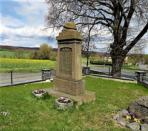 Kriegerdenkmal mit Stahlhelm und auf beiden großen Seiten eingesetzten Gedentafeln
