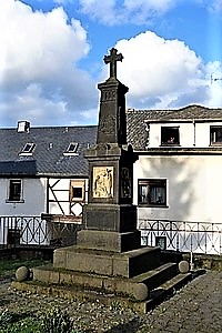 Neben der Kirche steht ein hohes, stufiges Denkmal mit quadratischem Grundriss. An den Seiten sind im unteren Teil Namenstafeln eingefasst. Darüber zeigen vier Reliefs an den Seiten die Darstellungen: Abschied des Soldaten von der Familie, Kampf im Schützengraben, Soldatentod mit Engel, der zum Himmel weist und einem erlösten Soldaten mit Palmzweig in Himmelssphären. Der obere Teil ist in Obeliskform gestaltet, als Abschluss obenauf ein Kreuz. In der Nähe steht ein altarähnlicher Gedenkstein, geziert mit Kreuz und Taube, auf dessen Seiten die Namen der Kriegsopfer des Zweiten Weltkrieges stehen.