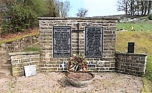 Sandsteinmauer mit Kreuz und zwei Gedenkplatten. Zwei weitere Namensplatten sind lose beigestellt