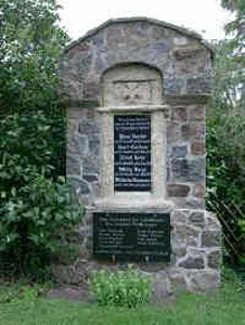 Auf dem Friedhof Ehrenmal für die Kriegstoten des 1. Weltkrieges: Eisernes Kreuz in Sandstein, darunter eingelassene Tafel und später unten angebrachte Tafel für die Gefallenen des 2. Weltkriegs.Ehrenliste für die Gefallenen des 1. Weltkriegs. Kriegervereinstafel in der Kirche. Gedenken auf Familiengräbern.