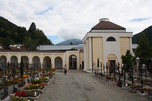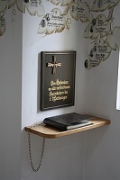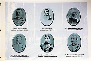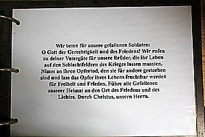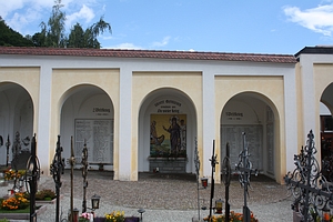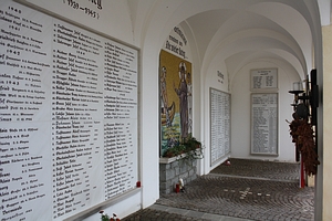 Denkmal auf dem Friedhof; dazu Gedenkbuch mit Fotos für die Opfer des 1. Weltkrieges in der Gedenkkapelle