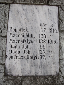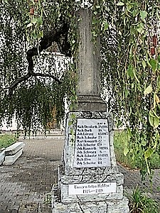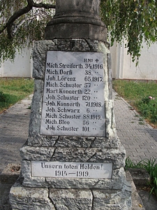 Das Denkmal, welches eine gebrochene Säule versinnbildlich, hat seinen Platz neben der Kirche gefunden. Das Postament, auf dem die Säule ruht, im Marmor gehauen, zeigt auf der südwestlichen Seite die Namen der elf gefallenen Siebenbürger Sachsen, auf der südöstlichen Seite die Namen der zwei gefallenen Rumänen und auf der nordwestlichen Seite die Namen der sechs gefallenen Neubauern. Das Denkmal wurde im am 31. August 1924 enthüllt.