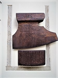 Das aus zwei Teilen bestehende Kunstwerk aus Eisenguss, 1991 von Hans-Dieter Bohnet (1926 – 2006) geschaffen, befindet sich an der Außenseite des Stadtmuseums und zeigt einen Richtblock und eine Zimmermannsaxt, ein handwerkliches Arbeitsgerät. Die Inschriften sind in Großbuchstaben ausgeführt.