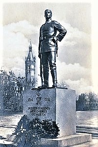 Die Denkmäler für die Gefallenen der in Schwerin stationierten Regimenter sind nicht mehr erhalten. Ob sich weitere Inschriften an den Denkmälern befunden haben ist auf den vorliegenden Bildern nicht ersichtlich. Diese drei Denkmäler wurden vom Künstler Wilhelm Wandschneider geschaffen und im Jahre 1923 im Schlossgarten eingeweiht. Der gleiche Künstler schuf auch eine Soldatenfigur, die auf dem Friedhof an der Kriegsgräberstätte aufgestellt wurde und bis heute erhalten ist.