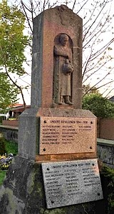 Denkmal für die Gefallenen des Ersten Weltkriegs: Stele mit Bildnis eines trauernden Soldaten und zwei Namenstafeln.