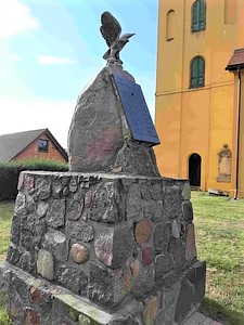 Vor der Kirche steht ein Denkmal für die Gefallenen des Ersten Weltkriegs aus gemauertem Naturstein mit aufgesetztem Findling und angebrachter Namenstafel, gekrönt von einem Adler.