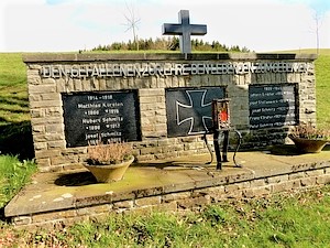 Sierscheid, Landkreis Ahrweiler, Rheinland-PfalzPLZ 53520 Das Denkmal befindet sich neben der Filialkirche St. Maternus in Sierscheid. Auf der Rückseite eines einstufigen Podests steht eine niedrige Bruchsteinmauer, in die drei Metallplatten eingelassen sind. Auf den beiden äußeren Platten stehen die Namen der Gefallenen beider Weltkriege, auf der mittleren ist ein großes Eisernes Kreuz. Oberhalb der Platten steht eine Widmung aus Metallbuchstaben, oben auf der Mauer ein Kreuz.