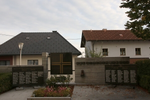 Bei der Kirche; Betonwand mit Aussparung für ein Kreuz, seitlich davon je eine Namenstafel; zusätzlich Daten von privaten Gedenksteinen