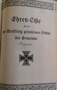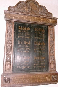 Denkmal für die Gefallenen des 1. und 2. Weltkriegs in Form eines Tempels, Vorderseite 1. Weltkrieg, Rückseite später eingravierte Namen des 2. Weltkriegs. Gedenktafeln in der Kirche.
