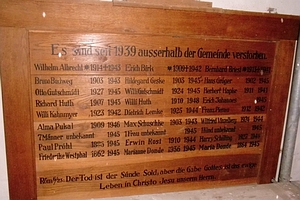 Die Gedenktafeln in der Kirche enthalten viel mehr Daten zu den Gefallenen als auf dem Denkmal notiert sind. Die Tafel für die Gefallenen des 2. Weltkriegs enthält außerdem bedeutend mehr Namen. Diese sind anscheinend Angehörige von örtlich angesiedelten Vertriebenen, mit vielen weiblichen Zivilopfern (zu einigen Namen findet sich in der VDK Datenbank nur ein einziger Eintrag mit selben Daten, die aus Ostpreußen und anderen östlichen Gegenden stammen).