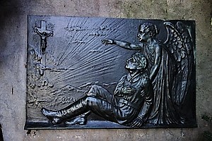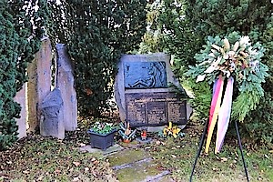 Das Ehrenmal steht in Nähe der Friedhofskapelle auf der örtlichen Begräbnisstätte. An einem Naturstein ist ein Metalltafel – Relief befestigt. Es zeigt einen gesunkenen Krieger zeigt, dessen Blick von einem Engel auf Jesus Christus gewiesen wird. Darunter sind die Namen der Kriegsopfer beider Weltkriege aufgelistet.