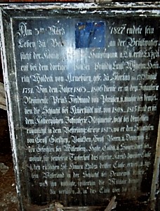 Epitaph 1740-1763: Denckmaal der Liebe und Ehren dem Hochwohlgebohrnen Herrn, Herrn Hans George Woldeck von Arneburg. Sr: König Majestät in Preussen hochbestalt gewesenen Generalmajor und Cheff eines Regiments Cuirassiers, Ritter des Ordens pour le Merite, Erb-Lehn-und Gerichts-Herrn auf Storckow, Armin und Rohrbeck, etc: der gebohren 16ten April 1712 und gestorben 14ten Januarii 1785 abends um 8 Uhr an einer langwierigen Gicht-Krankheit. Nach dem er dem König:hauße über 40 Jahr die treuesten und ersprießlichsten Dienste geleistet auch allen drey Schlesischen Feldzügen zur Zufriedenheit seines großen Königes und Nutz des Vater-Landes rühmlich beygewohnet und also 72 Jahr und acht Monat auf dieser Welt gelebet. Setzet die Hinterlaßene Höchst betrübte Witwe Frau Louise Margaretha von Beville mit welcher der Wohlseelige über 36 Jahr, in der vergnügtesten Ehe gelebet, und und mit Ihr zwey Söhne und fünf Töchter gezeuget, von denen ein Sohn und vier Töchter dem Vater in die Ewigkeit vorangegangen. Der eine Sohn und die eine Tochter, nebst der bekümmerten Gemahlin, beweinen und ehren die theure Asche. Seelig sind die Todten die in den Herrn sterben. Offb:14V.13