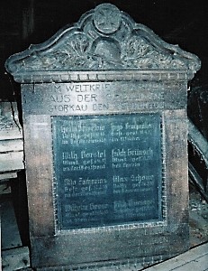 Im Weltkrieg starben aus der Gemeinde Storkau den Heldentod (Namen) Niemand hat größere Liebe denn die, dass er sein Leben lasset für seine Freunde.