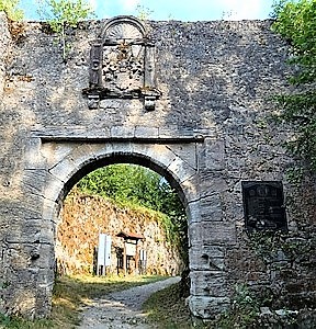 Polierte Steintafel mit eingravierten Inschriften, angebracht neben dem Tor der Ruine Streitburg. Angebracht vom Fränkischen Schweiz Verein für gefallene Mitglieder.