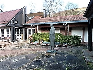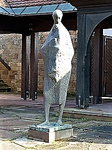 Friedhof. Skulptur einer trauernden Frau mit Kind. Vier Metallplatten mit den Namen der in den beiden Weltkriegen zu Tode Gekommenen.