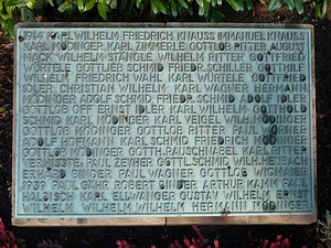Anmerkung: Zu den Toten des Ersten Weltkriegs siehe auch den Beitrag zum Ehrenmal bei der Strümpfelbacher Kirche. * Möglicherweise handelte es sich um den August Mack, geboren in Waiblingen, Kriegsfreiwilliger in der 12. Kompanie des Württembergischen Infanterieregiments Nr. 121, der am 17.12.1914 bei Kozlow Szlachecki fiel und an der Bzura begraben wurde. Wenn das Geburtsdatum 12.02.1899 stimmen sollte, war Mack bei seinem Tod 15 Jahre alt. (Kriegsstammrolle, lfd.Nr.427) Das würde mit der Angabe im etwa 1940 publizierten Gedenkbuch des Oberlehrers A. Mangold übereinstimmen, in dem das Alter Macks mit 16 Jahre angegeben wird. (../Gedenkbuecher/waiblingen_1. Weltkrieg_gdkb_bw.htm Ergänzungen in Rot: v. a. Ortsfamilienbuch Strümpfelbach (Digitalisat im Internet), Kriegsstammrollen im HStA Stuttgart und Verlustlisten Erster Weltkrieg bei genalogy.net Ergänzungen in Blau: Daten aus www.volksbund.de/graebersuche.html