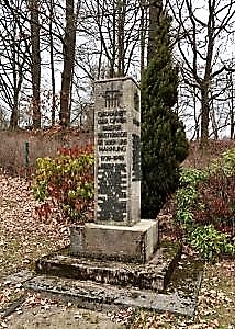 Eckige Steinsäule auf einem Podest. An der Säule sind die Inschrift und die Daten mit Einzelbuchstaben befestigt.