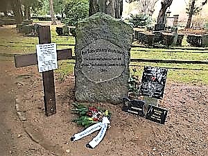 Auf dem Friedhof: ein Gedenkstein, drei Gedenktafeln und ein Gedenkkreuz mit Tafel.