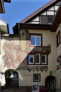 Plakette: Haus Schnitzer Spätgotisches Bürgerhaus erbaut 1503. Das Sgraffito zeigt die Einnahme Tiengens durch die Eidgenossen 1499.