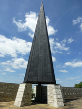 Die Anlage wird beherrscht von einem asymmetrisch aufgestellten Turmhelm, der die offene Gedenkhalle überdacht. An seinem Fuß ist die erste Inschrift eingemeißelt.