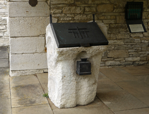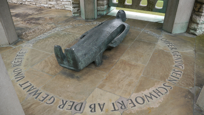 In der Halle liegt die Figur eines sterbenden Soldaten, die von einem weiteren Schriftzug umgeben ist.