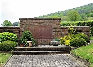 Mauer mit Sandsteinen verkleidet, darin ist eine Gedenkplatte eingefrügt.