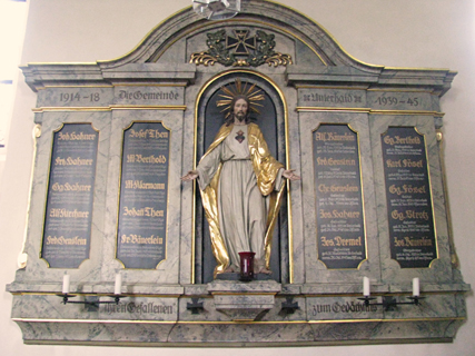 Gedenktafeln an der rechten Längswand in der katholischen Kirche St. Barbara.