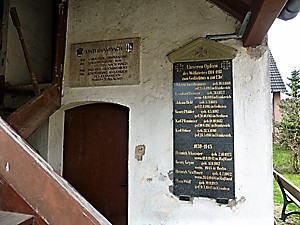 Schwarze Marmortafel im Untergeschoss des Glockenturms, mit Sandsteinbekrönung und Darstellung des Eisernen Kreuzes.