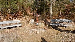 Soldatengrab Hartwich – Holzkreuz mit Inschrift zwischen zwei Sitzbänken am Weg von Schloß Roseck, am Rosecker Feld
