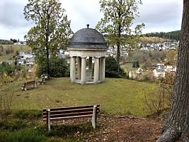 Tempelartiger Kuppelbau auf rundum stehenden Säulen. In der Mitte ein Block. Nach