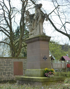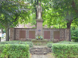 Gedenkstätte für die Opfer beider Weltkriege gegenüber der Pfarrkirche St. Jodoku, dem Friedhofseingang vorgelagert. Auf einem Buntsandsteinsockel Darstellung eines Kriegers, der sein Schwert zieht, auf einem aufbäumenden Pferd, 1922 errichtet. Bis zur Erweiterung der Anlage im Jahr 1956 standen die Namen der Kriegsopfer des Ersten Weltkriegs auf den Sockelleisten. Bei der Erweiterung entstand hinter dem Denkmal eine Bruchsteinmauer mit vier Tafeln aus Buntsandstein. Auf ihnen die Namen der Kriegsopfer beider Weltkriege.