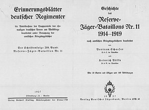 Erinnerungsblätter deutscher Regimenter: Geschichte des Reserve-Jäger-Bataillons Nr. 11 1914-1919 nach amtlichen Kriegstagebüchern bearbeitet von Bertram Schaefer, Lt. d. Ld. und Heinrich Völke Lt. d. R. im Bataillon. Verlag Deutscher Jägerbund, Berlin SW 48, 1927. Ergänzungen wurden der Ehrentafel des reichsdeutschen Adels, dem Ehrenmal des preußischen Offizierkorps und den Verlustlisten des 1. Weltkriegs entnommen. Verluste: 50 Offiziere, ca. 714 Oberjäger und Jäger.