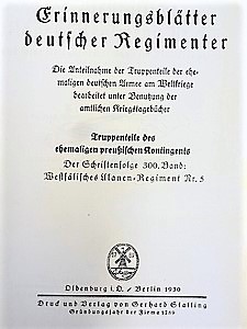 Quelle: Erinnerungsblätter deutscher Regimenter, Truppenteile des ehemaligen preußischen Kontingents, Schriftenfolge 300. Band, Westfälisches Ulanen-Regiment Nr.5, Verlag von Gerhard Stalling, Oldenburg i.O. / Berlin 1930.