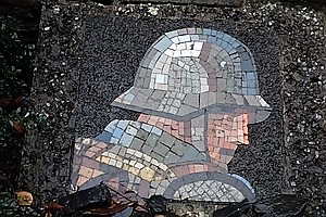 lesbar. Vor dem Ehrenmal ist das Mosaikbild eines behelmten Soldatenkopfes.