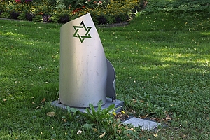 Im Park der ev. Versöhnungskirche; Metallspirale im oberen Teil mit ausgelasertem Davidstern, am Sockel eine kleine Plakette und am Boden eine Infotafel.