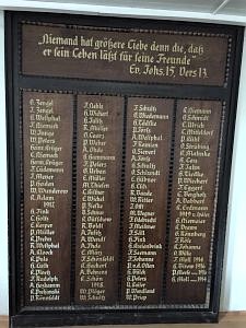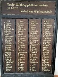 In der Kirche St. Marien von Waren hängen rechts und links des Eingangs große Holztafeln mit den Namen der Gefallenen des Ersten Weltkriegs.