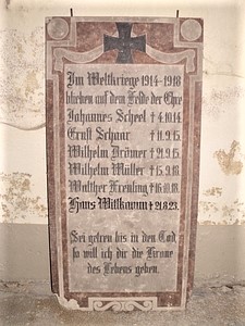 Im Weltkriege 1914 - 1918 blieben auf dem Felde der Ehre. (Namen) Sei getreu bis in den Tod, so will ich dir die Krone des Lebens geben.